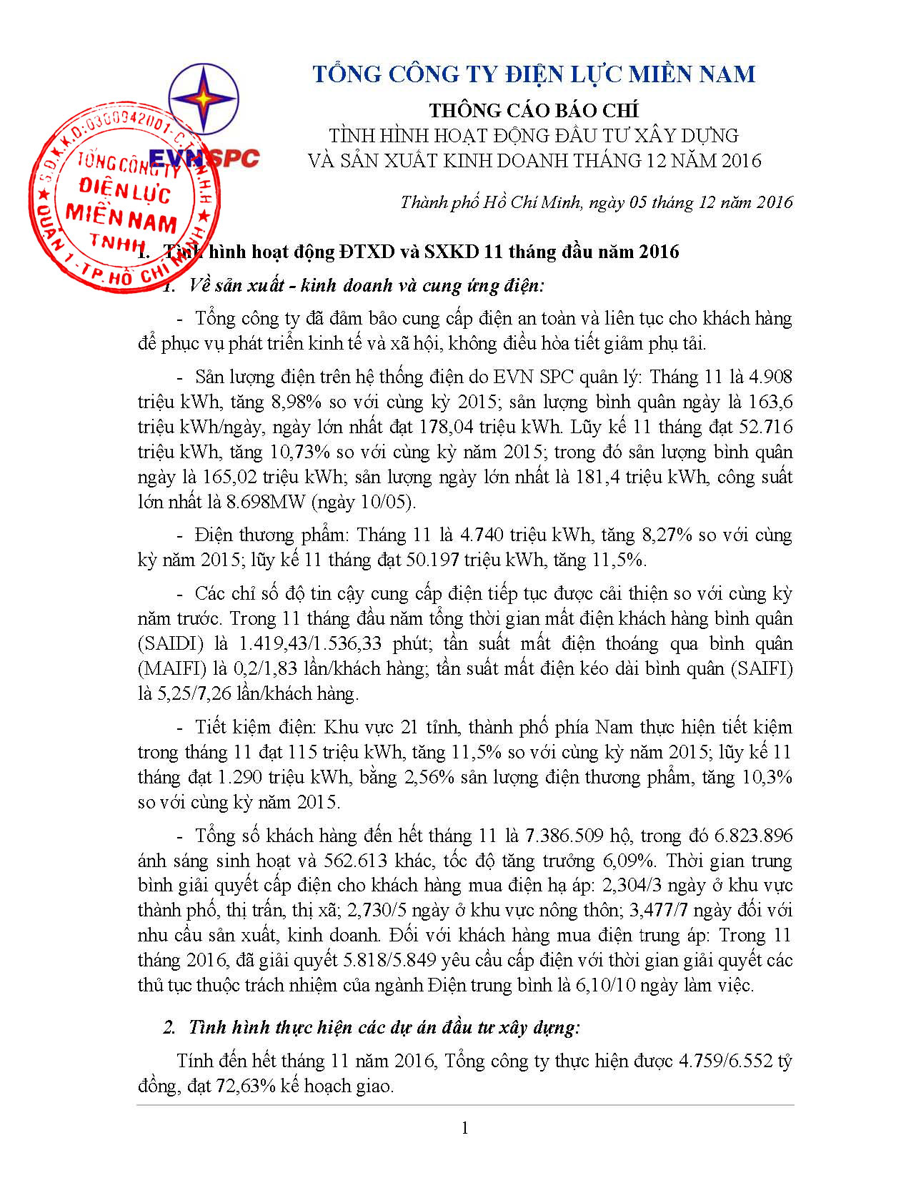 I. Tình hình hoạt động ĐTXD và SXKD tháng 11 năm 2016: 1. Về sản xuất - kinh doanh và cung ứng điện: Trong tháng 11 năm 2016, Tập đoàn Điện lực Việt Nam (EVN) đã cung cấp đủ điện, ổn định, an...