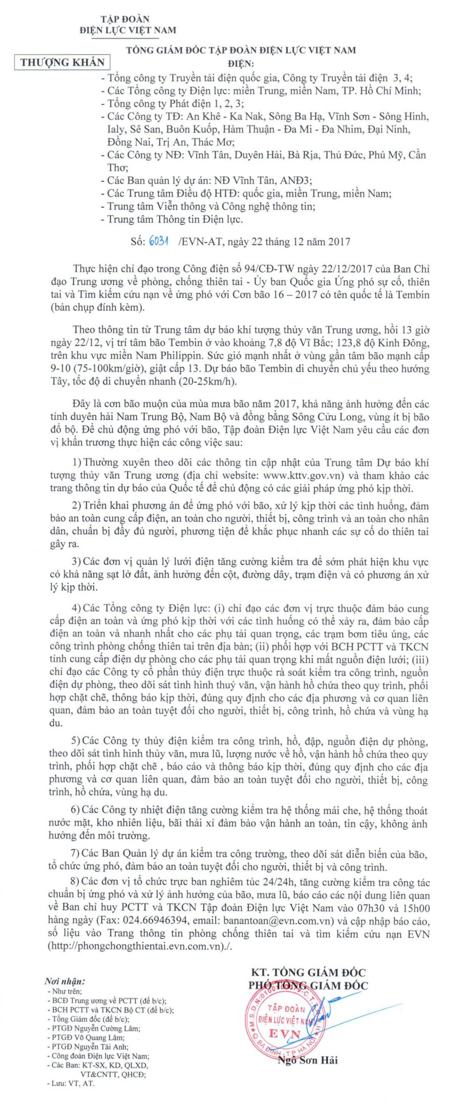 Công điện số 6031/EVN-AT của Tập đoàn Điện lực Việt Nam ngày 22/12/2017 gửi các đơn vị trực thuộc Tập đoàn về chủ động ứng phó với bão số 16 có tên quốc tế là Tembin.