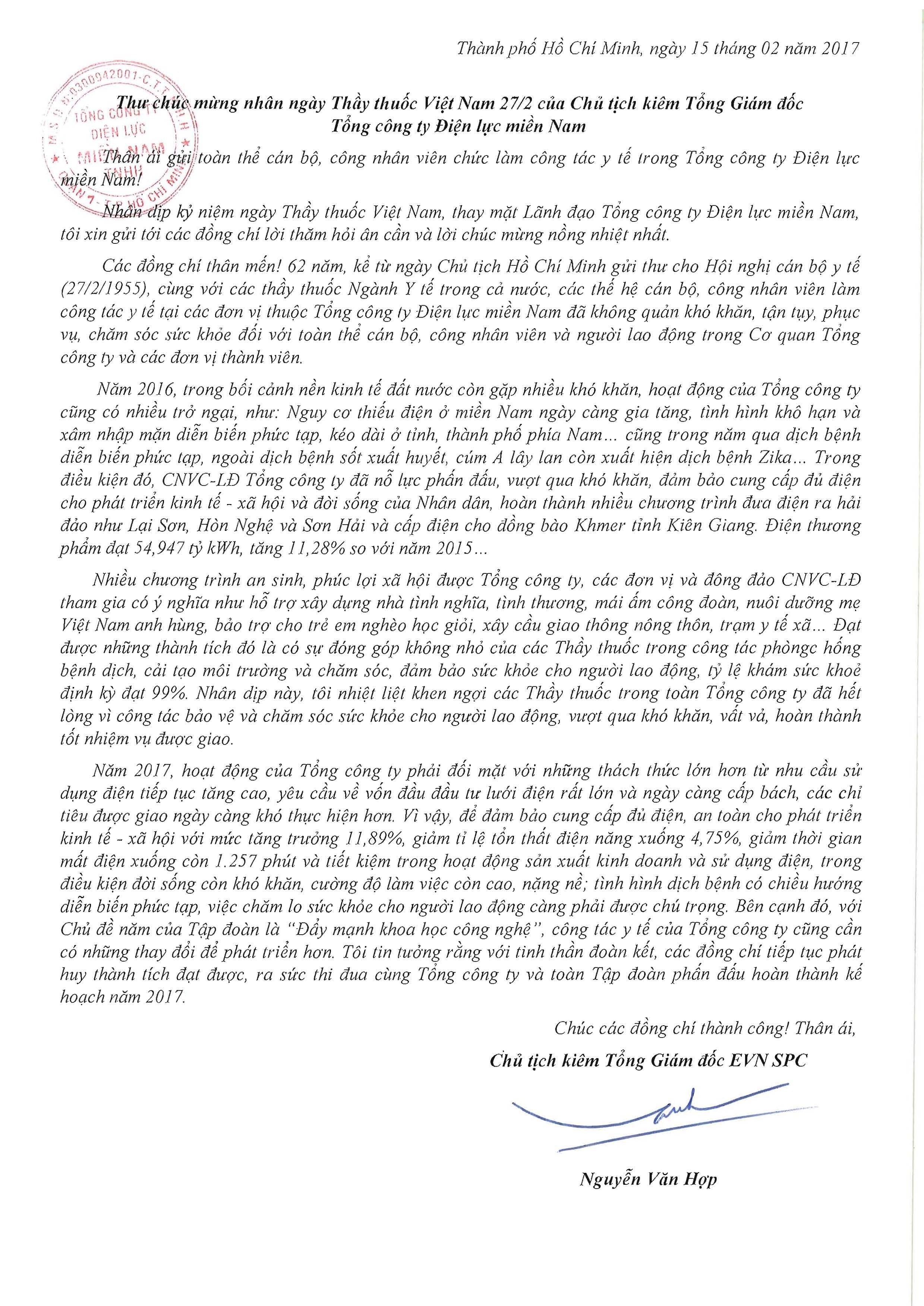 Thư chúc mừng nhân ngày Thầy thuốc Việt Nam 27/2 của Chủ tịch kiêm Tổng Giám đốc Tổng công ty Điện lực miền Nam