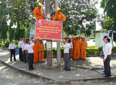 Gắn biển công trình sửa chữa lớn đường dây trung và hạ thế khu vực Mang Thít