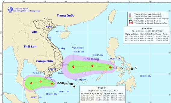 Sáng 2/11, áp thấp nhiệt đới trên vùng biển phía Nam Cà Mau đã suy yếu thành một vùng áp thấp. Trong khi đó, cơn áp thấp nhiệt đới mới trên Biển Đông vẫn đang mạnh dần.