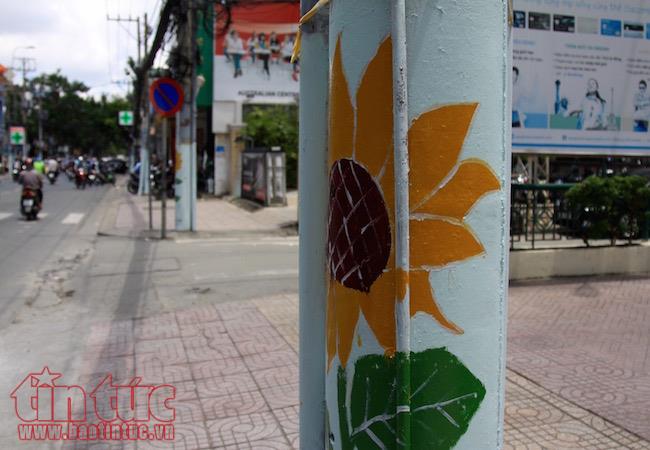 59 cột điện bị dán quảng cáo nhếch nhác trước đây đã được thay thế bằng sắc màu vàng rực của hoa Hướng dương, vừa tô điểm thêm vẻ đẹp đường phố, vừa... chống nạn dán quảng cáo lên cột điện.