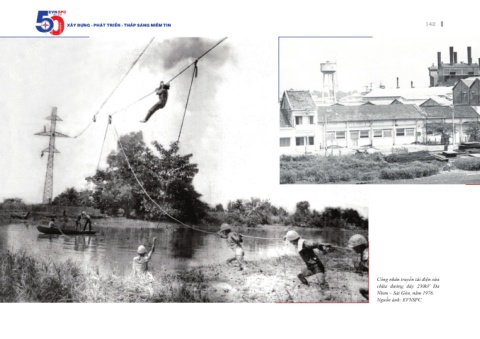 EVNSPC 1975 - 2025 Xây dựng - Phát triển - thắP sáng niềm tin 142 Công nhân truyền tải điện sửa chữa đường dây 230kV Đa Nhim – Sài Gòn, năm 1976. Nguồn ảnh: EVNSPC.