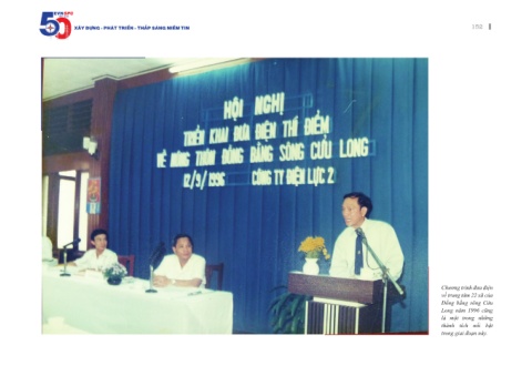 EVNSPC 1975 - 2025 Xây dựng - Phát triển - thắP sáng niềm tin 152 Chương trình đưa điện về trung tâm 22 xã của Đồng bằng sông Cửu Long năm 1996 cũng là một trong những thành tích nổi bật trong giai đoạn này.