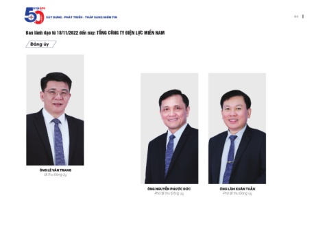EVNSPC 1975 - 2025 Xây dựng - Phát triển - thắP sáng niềm tin 44 Ban lãnh đạo từ 18/11/2022 đến nay: tổnG cÔnG ty đIỆn lỰc mIỀn nam Đảng ủy Ông Lê Văn Trang Bí thư Đảng ủy Ông nguyễn PhướC ĐứC Ông Lâm Xuân TuẤn Phó Bí thư Đảng ủy Phó Bí thư Đảng ủy