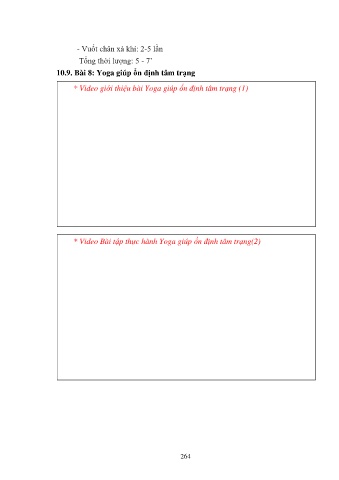 - Vuốt chân xả khí: 2-5 lần Tổng thời lượng: 5 - 7’ 10.9. Bài 8: Yoga giúp ổn định tâm trạng * Video giới thiệu bài Yoga giúp ổn định tâm trạng (1) * Video Bài tập thực hành Yoga giúp ổn định tâm trạng(2) 264