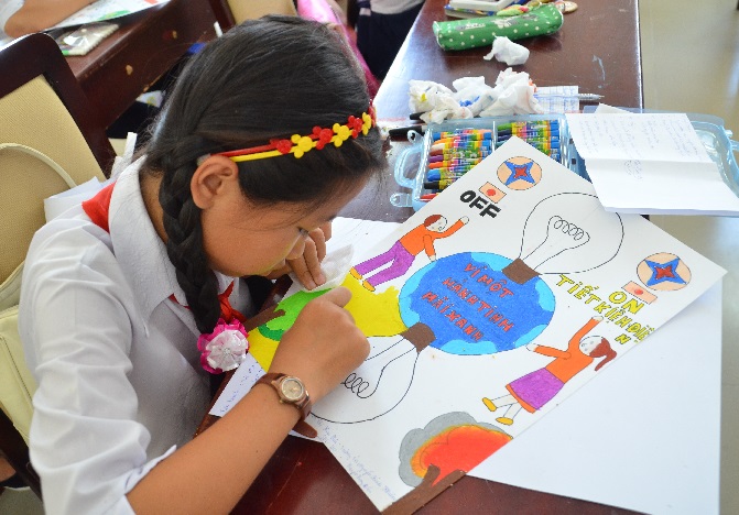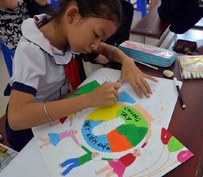 Học sinh tiểu học tham gia thi vẽ tranh cổ động tiết kiệm điện.