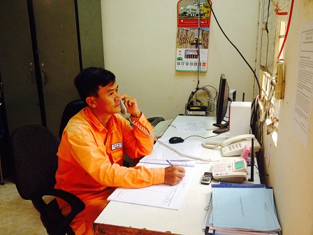Công nhân Bộ phận sửa chữa lưới điện trả lời điện thoại khách hàng.