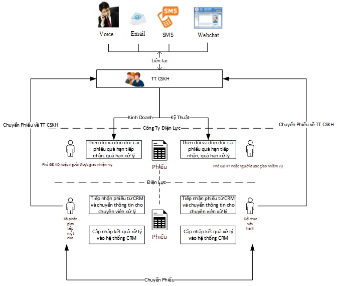 + Kênh giao tiếp gặp trực tiếp: Khách hàng có thể đến gặp trực tiếp nhân viên tại “một cửa” của từng đơn vị Điện lực, Công ty Điện lực để yêu cầu về dịch vụ. Các yêu cầu của khách hàng sẽ được nhân viên “một cửa” cập nhật vào hệ thống CRM để tiến hành xử lý thoả đáng.
