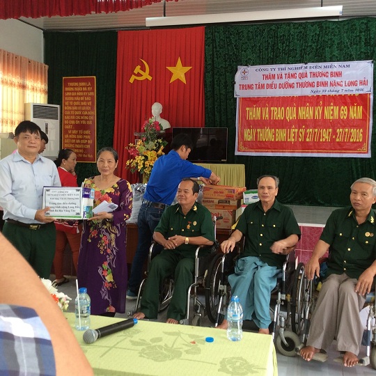 Tại TP HCM : Công ty Thí nghiệm Điện miền Nam đã đến thăm và trao tặng 63 phần quà gồm Kem đánh răng, bàn chải, khăn tắm, trà, bánh, cà phê, gạo lức rong biển với tổng giá trị trên 10 triệu đồng cho các thương binh nặng tại Trung tâm điều dưỡng thương binh Long Đất huyện Long Hải, tỉnh Bà Rịa-Vũng Tàu.