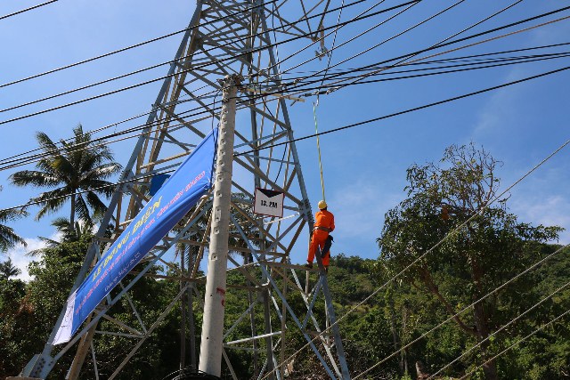 Công nhân điện đang kiểm tra lưới điện trên đảo Lại Sơn