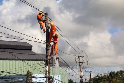 Công nhân Điện lực Kiên Giang cải tạo nâng cấp lưới điện ở xã Minh Hòa (Châu Thành, Kiên Giang). Ảnh: Lê Huy Hải/TTXVN