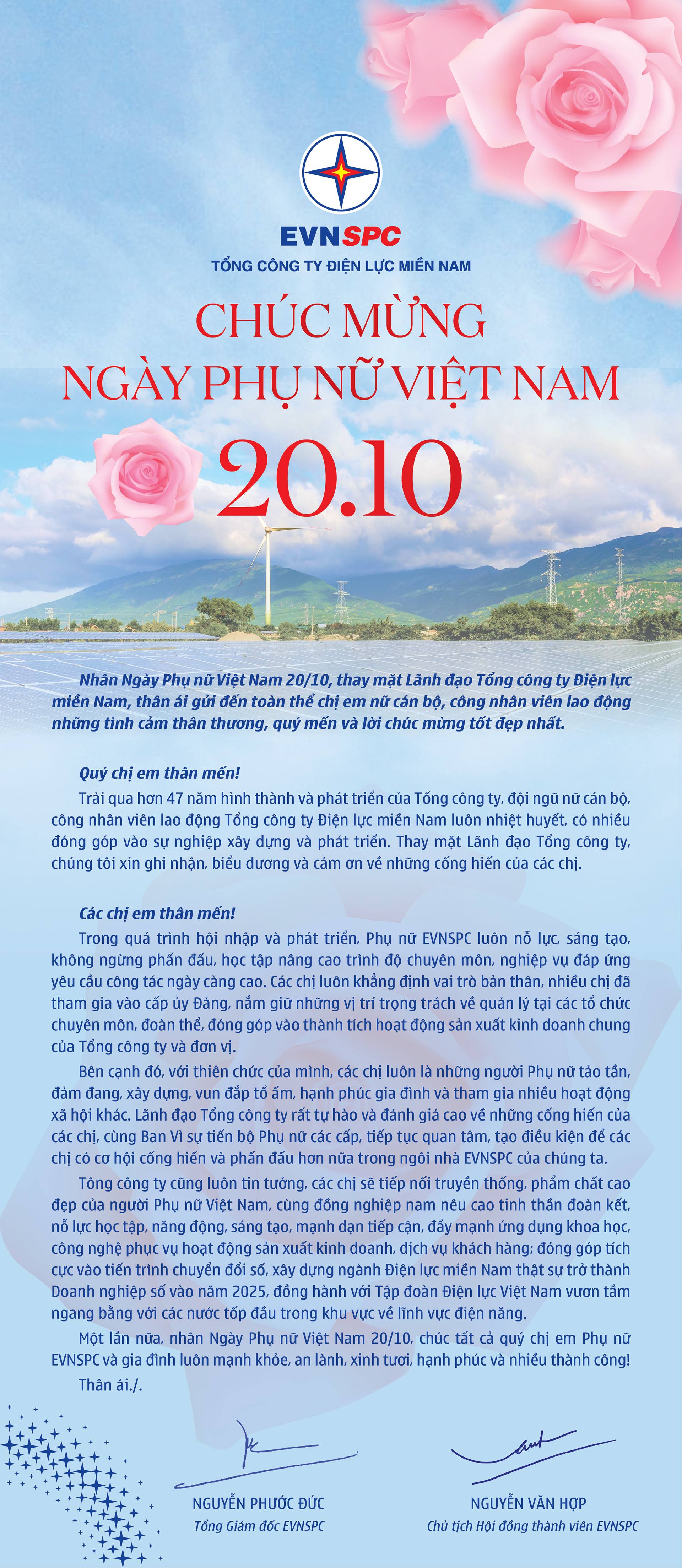 Thư chúc mừng của Lãnh đạo Tổng công ty Điện lực miền Nam nhân Ngày Phụ nữ Việt Nam 20/10