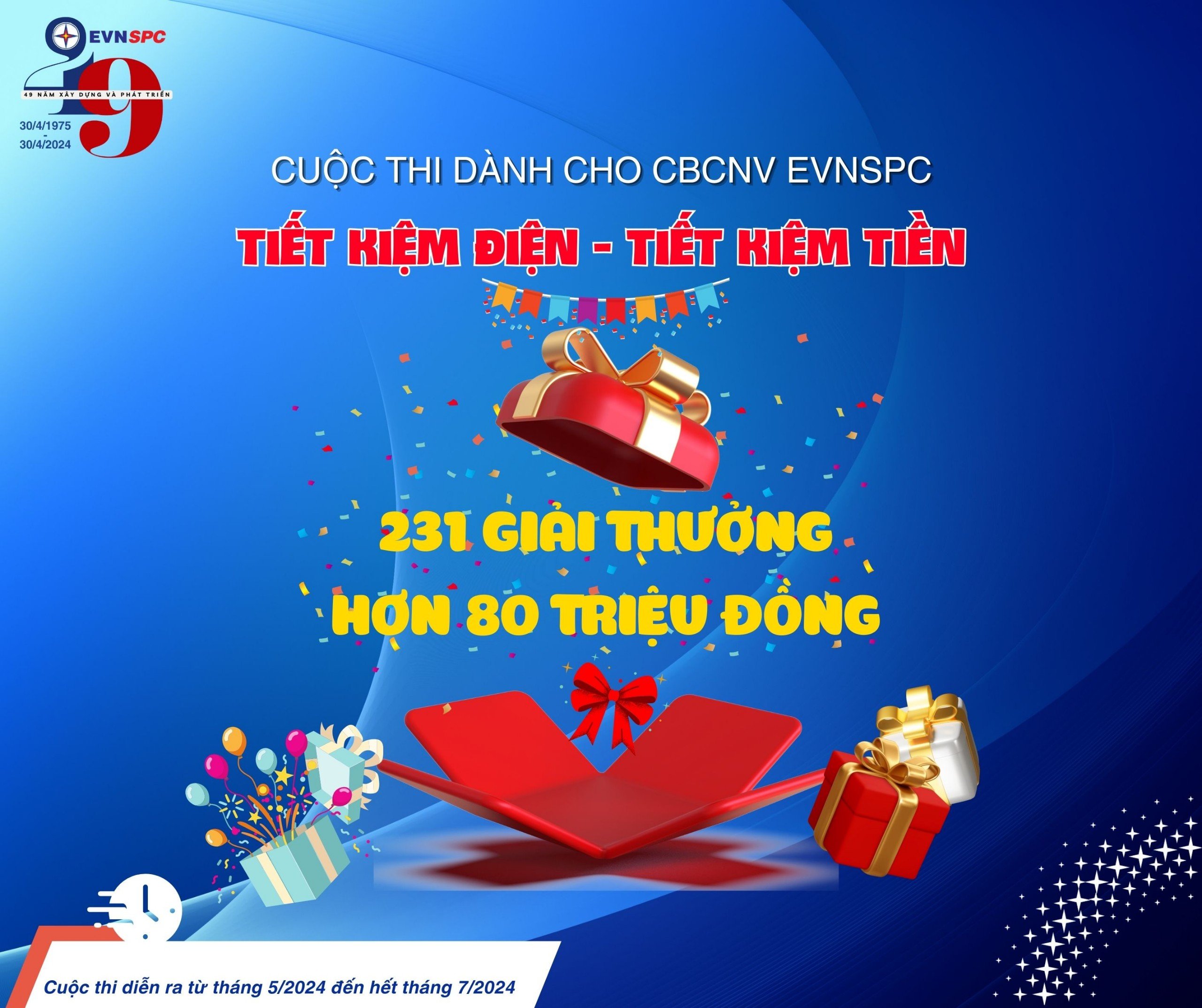 Đây là cuộc thi thứ 2 trong khuôn khổ chương trình, dành cho tất cả CBCNV thuộc 21 Công ty Điện lực thành viên EVNSPC. Thời gian diễn ra cuộc thi này bắt đầu từ ngày 01/5/2024 đến ngày 31/7/2024. CBCNV tham gia Cuộc thi “Tiết kiệm điện – Tiết kiệm tiền” trên trang fanpage EVNSPC để tham gia theo 2 bước sau: