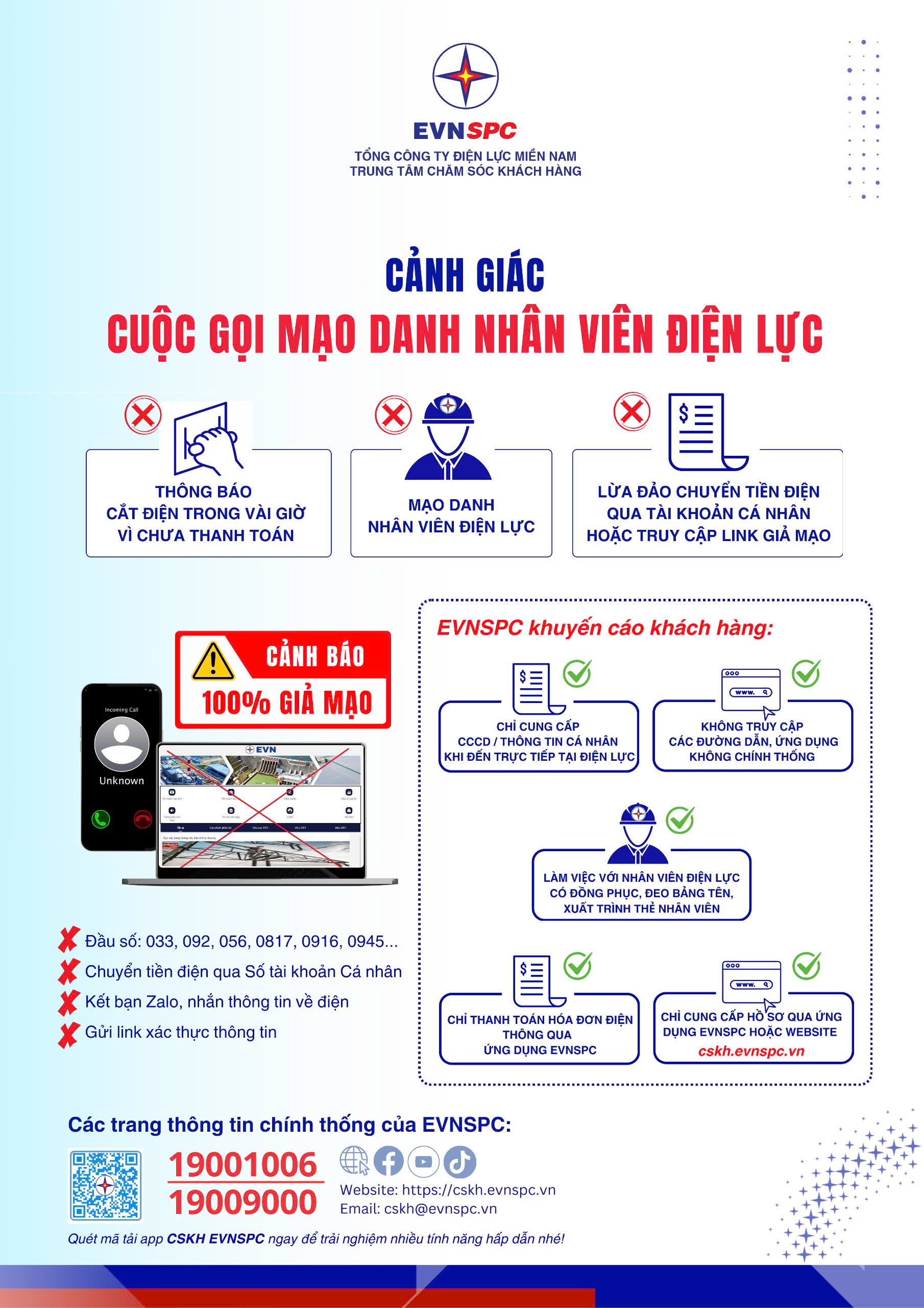 Nếu nhận được cuộc gọi hoặc tin nhắn nghi ngờ, hãy liên hệ ngay tổng đài CSKH EVNSPC qua hai đầu số 19001006 – 19009000 để xác minh. Hoặc truy cập Website: www.cskh.evnspc.vn; App: CSKH EVNSPC trên App Store/Google Play; Zalo Official Account: TCT Điện lực miền Nam để phản hồi thông tin.
