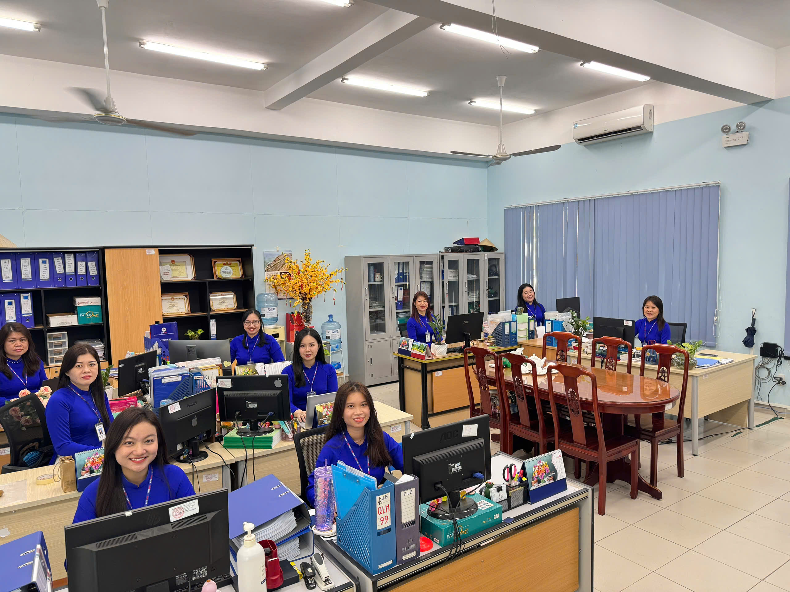 Nữ công Trường Cao đẳng Điện lực TPHCM trong trang phục áo dài truyền thống tại nơi làm việc (Ảnh: HEPC)