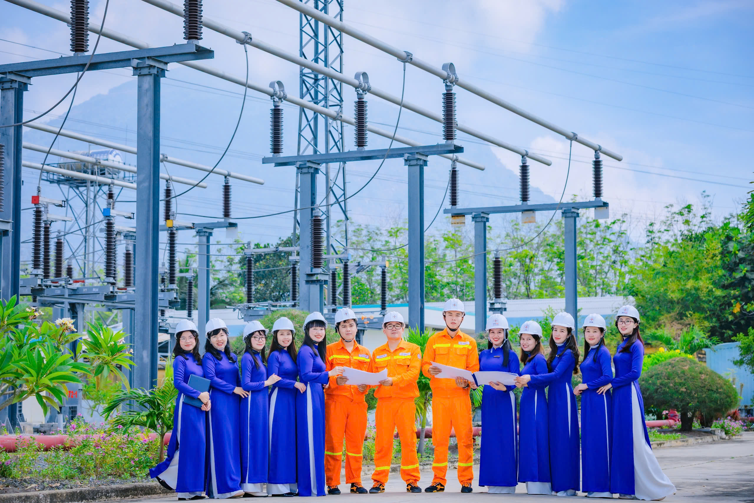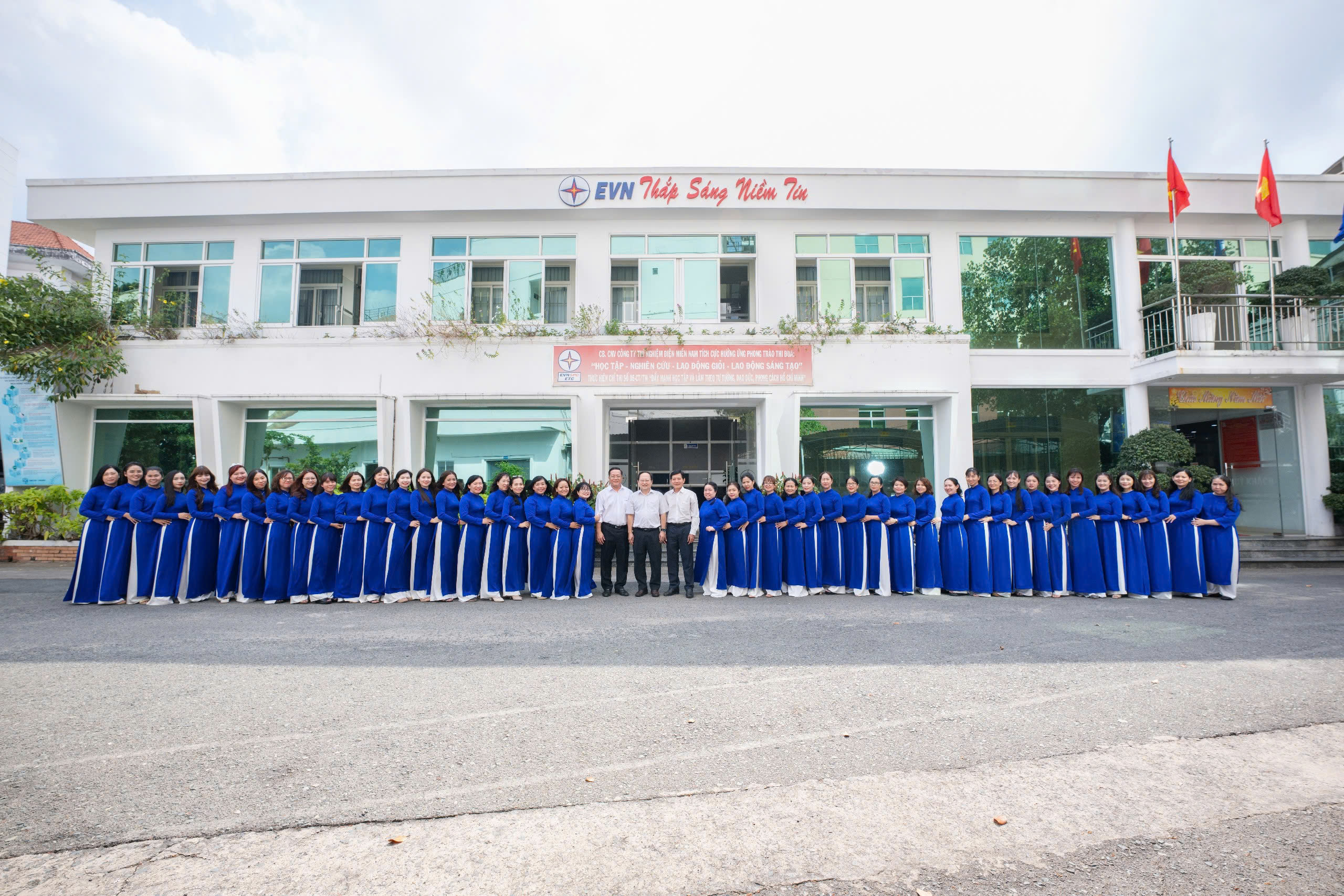 những nữ cán bộ Công ty Điện lực Long An (PCLA) khoác lên mình tà áo dài xanh mang thương hiệu ngành điện Việt Nam, thể hiện sự duyên dáng, tự hào và tinh thần cống hiến. Hình ảnh này không chỉ tôn vinh vẻ đẹp của người phụ nữ ngành điện mà còn thể hiện sự gắn kết giữa truyền thống và hiện đại,