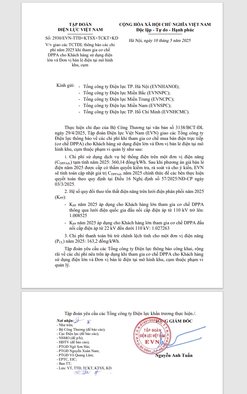 Thực hiện chỉ đạo của Bộ Công Thương tại văn bản số 3138/BCT-ĐL ngày 29/4/2025, Tập đoàn Điện lực Việt Nam (EVN) đã có văn bản số 2930/EVN-TTĐ+KTSX+ TCKT+KD giao các Tổng công ty Điện lực thông báo các chi phí năm 2025 khi tham gia cơ chế mua bán điện trực tiếp (DPPA) cho Khách hàng sử dụng điện lớn và Đơn vị bán lẻ điện tại mô hình khu, cụm.