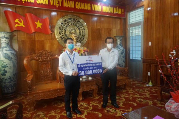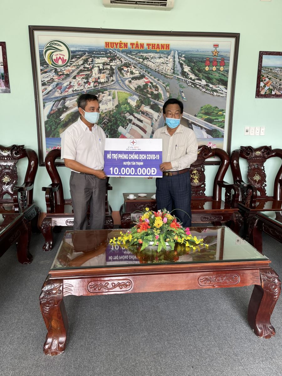 Tại huyện tân Trụ, đại diện Công ty Điện lực Long An đã trao số tiền 30 triệu đồng ủng hộ Quỹ phòng chống dịch bệnh COVID-19 đến Mặt trận tổ quốc Việt Nam huyện Tân Trụ tỉnh Long An. Tiếp nhận tiền ủng hộ, ông Nguyễn Văn Dễ - Chủ tịch Ủy ban Mặt trận tổ quốc Việt Nam huyện Tân Trụ, phát biểu đã ghi nhận tấm lòng quý báu của tập thể cán bộ công nhân viên, người lao động PCLA, đồng thời gửi lời cảm ơn sâu sắc đến lãnh đạo và tập thể cán bộ công nhân viên, người lao động của PCLA trong thời gian qua đã luôn đồng hành, chung tay góp sức cùng chính quyền và nhân dân huyện Tân Trụ và tỉnh Long An đẩy lùi dịch bệnh.