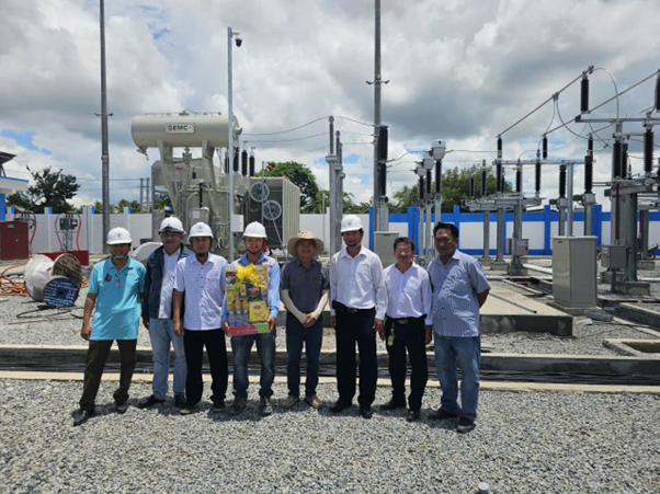 Thành viên HĐTV EVNSPC Lê Xuân Hải (thứ 5 từ trái qua) đến thăm hỏi, kiểm tra ĐD trạm biến áp 110kV Phú Thuận, 110kV Ba Tri - Bình Thạnh, tỉnh Vĩnh Long (Ảnh: PCVL)