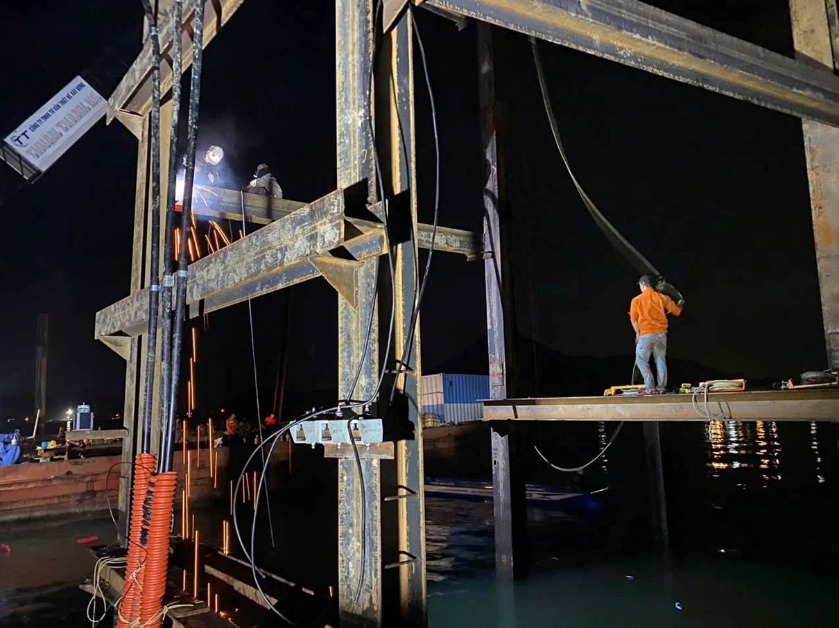 Giữa gió biển và đêm tối, công trường vẫn sáng đèn. Những đôi tay không ngừng nghỉ của lực lượng thi công vẫn đều đặn hoàn thiện từng công đoạn.