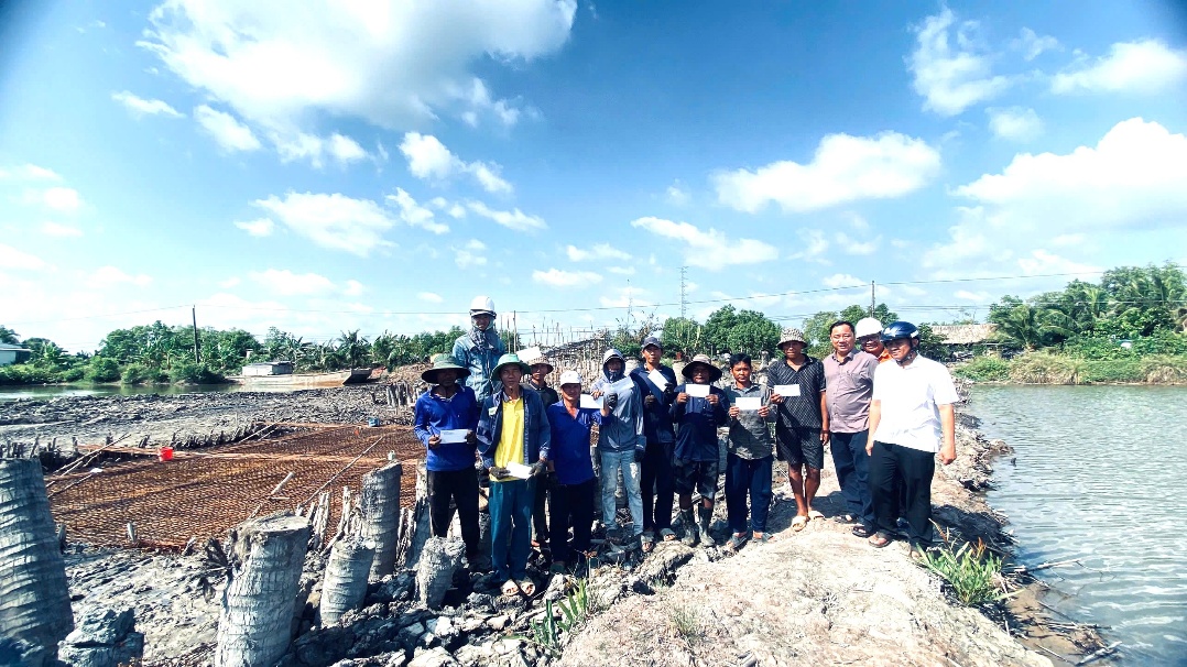 Lãnh đạo Công ty Điện lực Cà Mau tặng quà động viên người lao động thi công trong ngày đầu tiên của năm 2025 tại Công trình “Xuất tuyến 4 mạch đường dây 110kV Trạm 220kV Năm Căn”.  (ảnh: Minh Chánh)