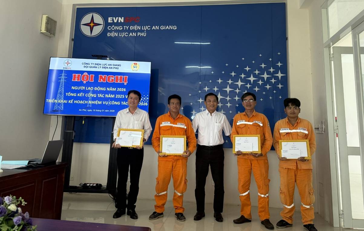 Đội trưởng Đội Quản lý Điện An Phú (giữa) trao khen thưởng những cá nhân có thành tích năm 2025.