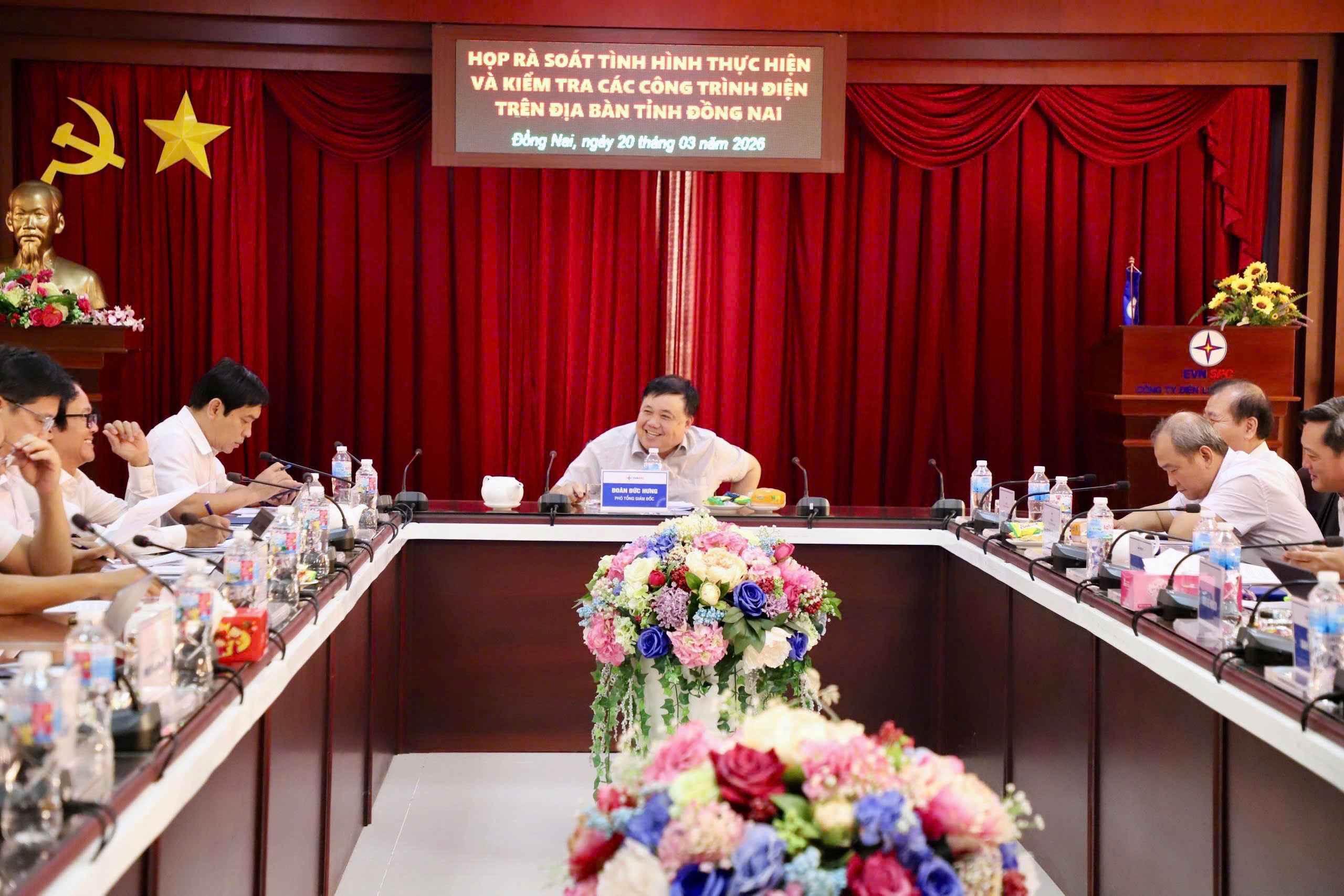 Ông Đoàn Đức Hưng – Phó Tổng Giám đốc EVNSPC chủ trì buổi làm việc, tham dự có đại diện các Ban chuyên môn của EVNSPC; các đơn vị trực thuộc gồm: Công ty Điện lực Đồng Nai (PCĐN), Ban Quản lý dự án Lưới điện miền Nam (ALĐMN), Công ty Tư vấn Điện miền Nam (TVĐMN), Ban Quản lý dự án Điện lực miền Nam (AĐLMN), các nhà thầu thi công.