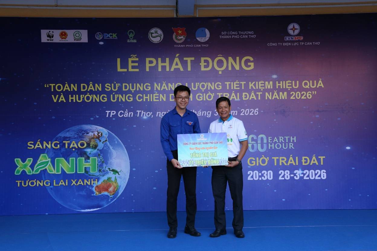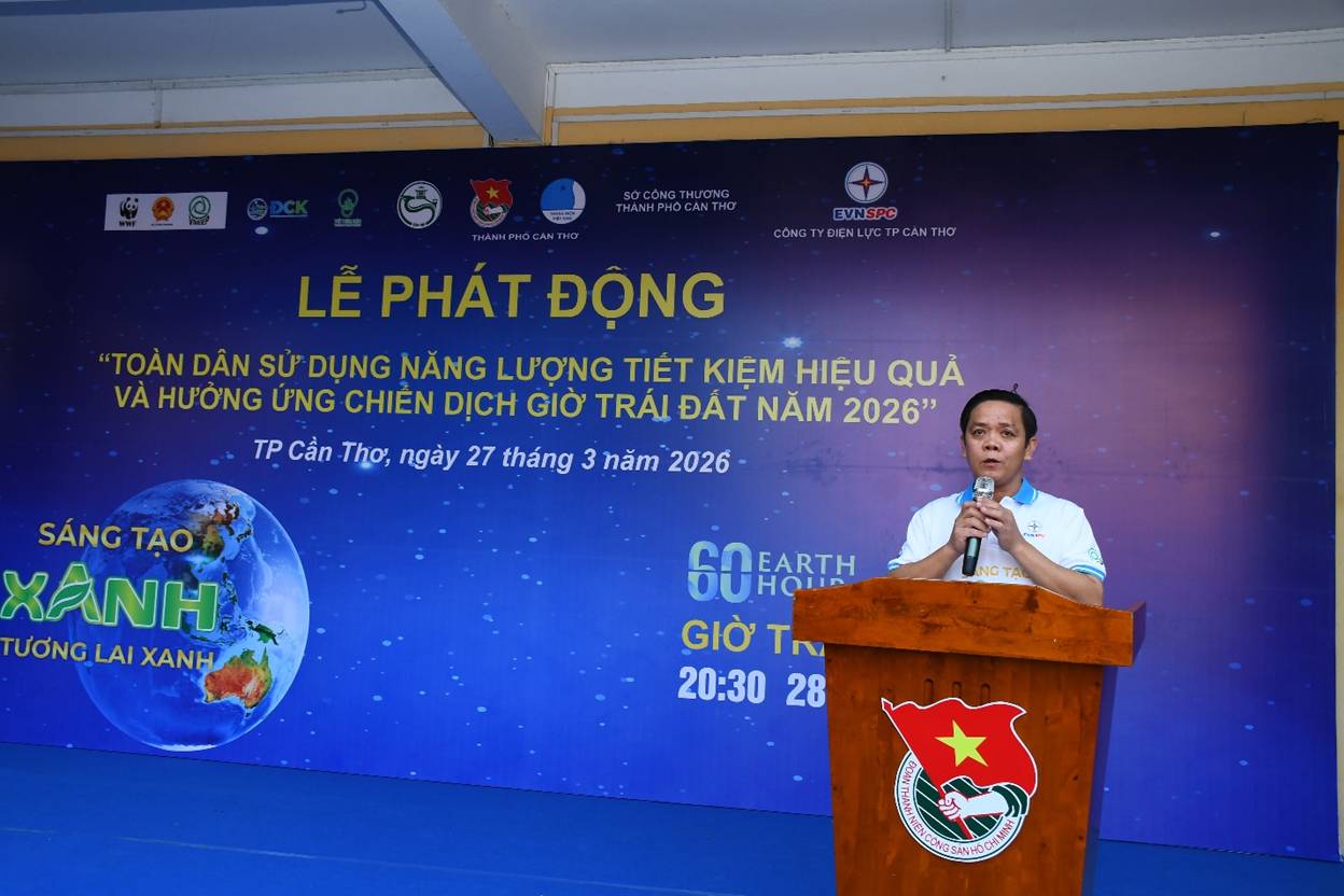 Phát biểu tại buổi lễ, ông Lê Thành Thanh - Phó Giám đốc Sở Công Thương cho biết: “Cần Thơ sẽ triển khai nhiều hoạt động hưởng ứng Giờ Trái đất 2026, từ tuyên truyền, vận động người dân, doanh nghiệp, cơ sở kinh doanh đến việc khuyến khích tham gia giải chạy trực tuyến diễn ra từ 21/3 đến 11/4/2026 nhằm lan tỏa thông điệp tiết kiệm năng lượng. Ông kêu gọi toàn thể tổ chức, cá nhân cùng chung tay lan tỏa thông điệp “Sáng tạo xanh – Tương lai xanh”, đồng thời thực hiện tắt các thiết bị điện không cần thiết từ 20h30 đến 21h30, tối thứ Bảy ngày 28/3/2026 để hưởng ứng Giờ Trái đất.”