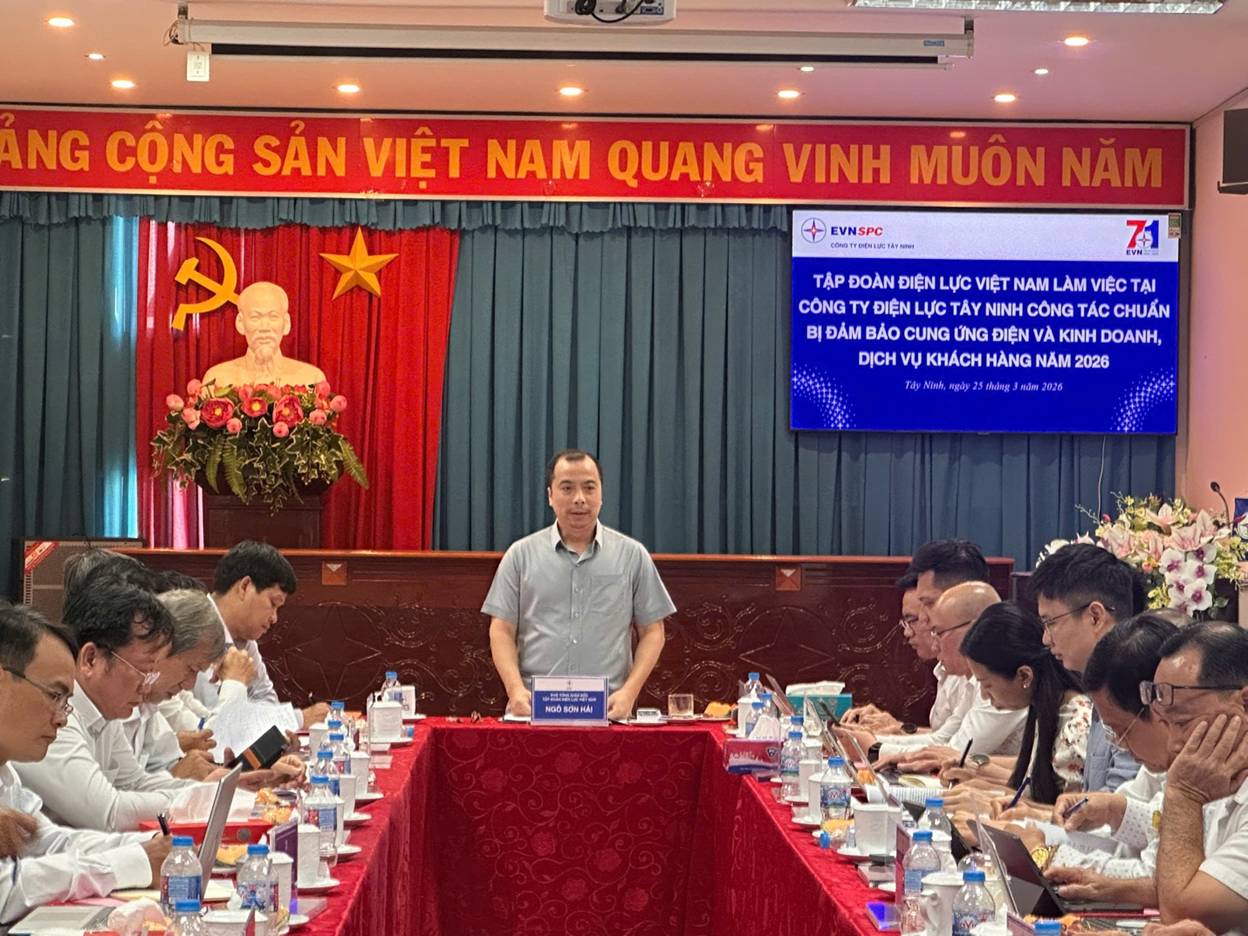 Đoàn công tác của Tập đoàn Điện lực Việt Nam (EVN) vừa có buổi làm việc tại Công ty Điện lực Tây Ninh (PC Tây Ninh) nhằm kiểm tra, rà soát công tác đảm bảo cung ứng điện và kinh doanh, dịch vụ khách hàng trong mùa khô năm 2026. Buổi làm việc tập trung đánh giá toàn diện hiện trạng hệ thống điện, kết quả thực hiện các chỉ tiêu sản xuất kinh doanh, cũng như việc triển khai các giải pháp chủ động ứng phó với nhu cầu phụ tải tăng cao trong mùa nắng nóng.